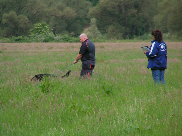 Gerade als wir alle Vorbereitungen abgeschloßen hatten trafen pünktlich um 07:00 Uhr sowohl die Prüfer, Schutzdiensthelfer, Fährtenleger als auch die ersten Teilnehmer ein.